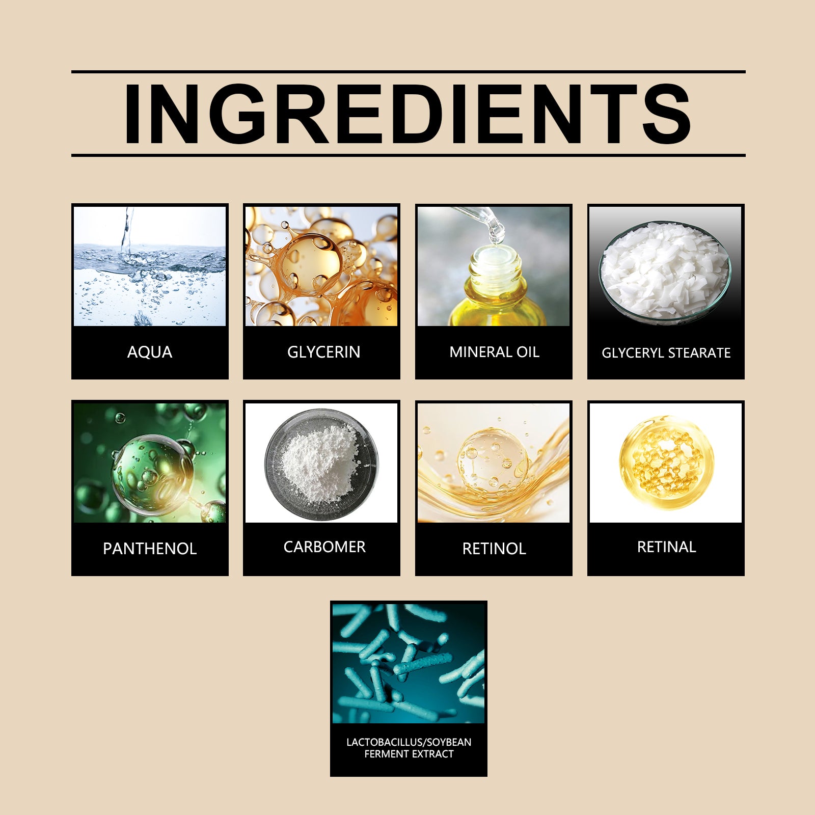 Our retinol eye cream is carefully blended with glycerin, mineral oil and glycerin stearate. Designed to tighten eye contours and create smooth, rough skin. It's easy to use: apply it around your eyes with your fingertips. Massage until absorbed. Use morning and evening. And can moisturize and repair the skin barrier.