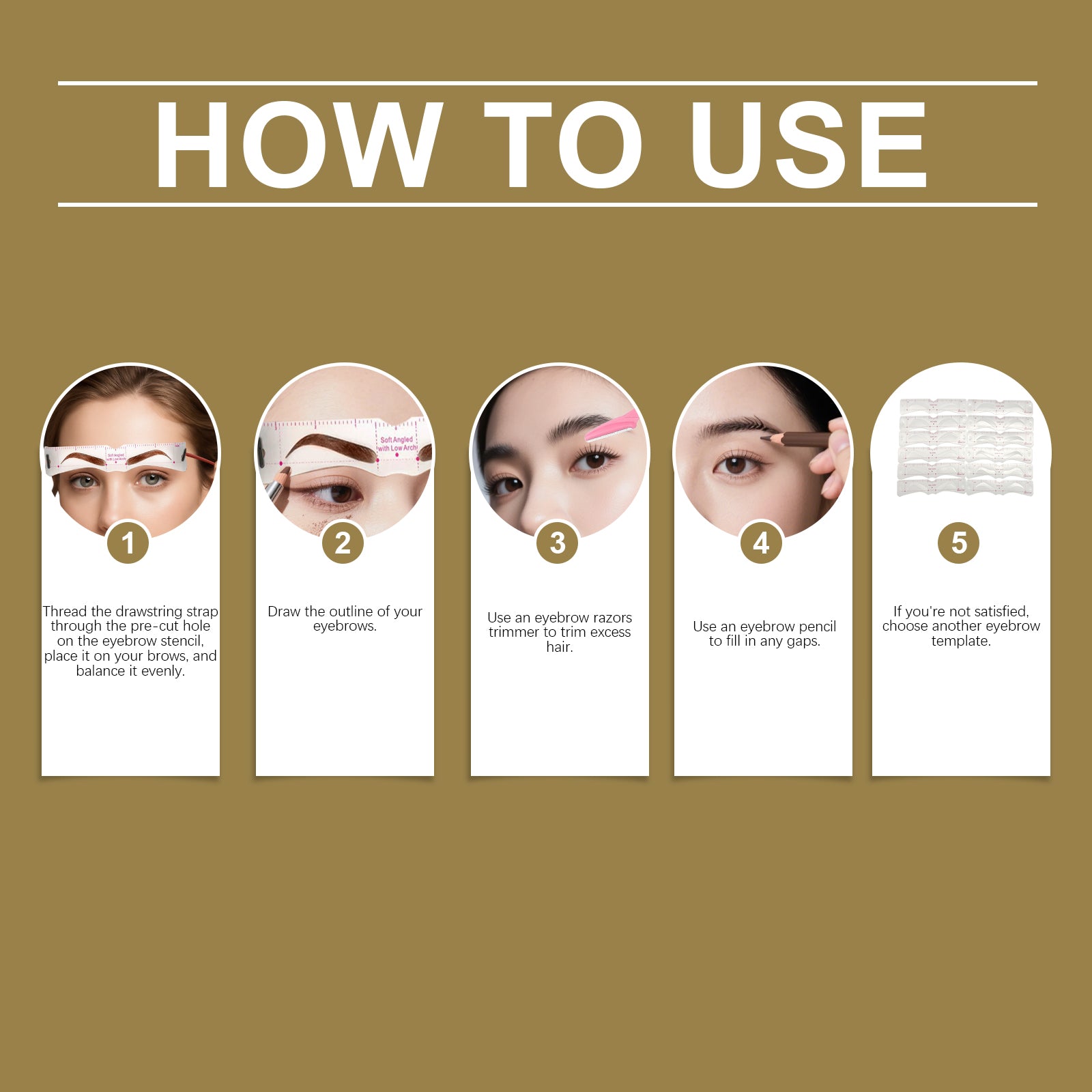 Our Eyebrow Stamp Stencil Kit, made with PEVA, customizes brows for all makeup needs. Easy to use: thread drawstring, place, outline, trim, fill. Precise, user-friendly.